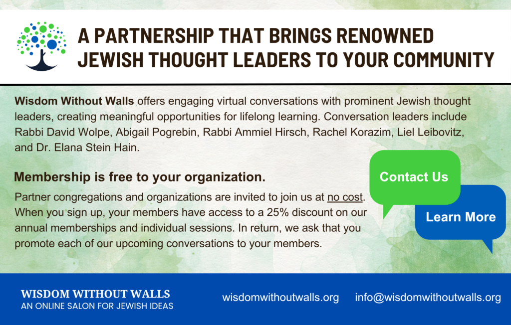 Wisdom Without Walls offers engaging virtual conversations with prominent Jewish thought leaders, creating meaningful opportunities for lifelong learning. Conversation leaders include Rabbi David Wolpe, Nancy Berg, Mark Oppenheimer, Yiscah Smith, and Rafael Medoff.